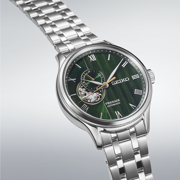 This watch features a striking deep green dial, inspired by the serene beauty of a Japanese garden, within a silver stainless-steel case. The open-heart peek-through at the dial offers a glimpse of the intricate movement inside, enhancing its artistry, completed with a stainless-steel bracelet, offering both sophistication and durability.