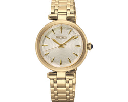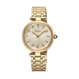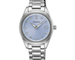 Seiko Ladies Dress 50 metresSpecificationsMovementCaliber Number V137Movement Type SolarPrecision ±15 seconds per monthPower reserve Operating for approx. 6 months (when fully charged)Functions Overcharge prevention function Date displayCase/BandCase Material Stainless steelCase Size Thickness:8.0mm Diameter:27.6mm Lug-to-lug:33.2mm Crystal...