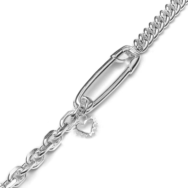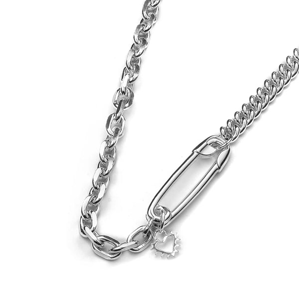 The 'Punk Pin Choker' features a mix of a curb chain & diamond cut cable chain with a connecting safety pin pendant.